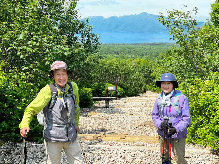 支笏湖展望台で「これだけ見晴らしの良い山はなかなかないよ」と笑顔を見せる函館市からの夫婦
