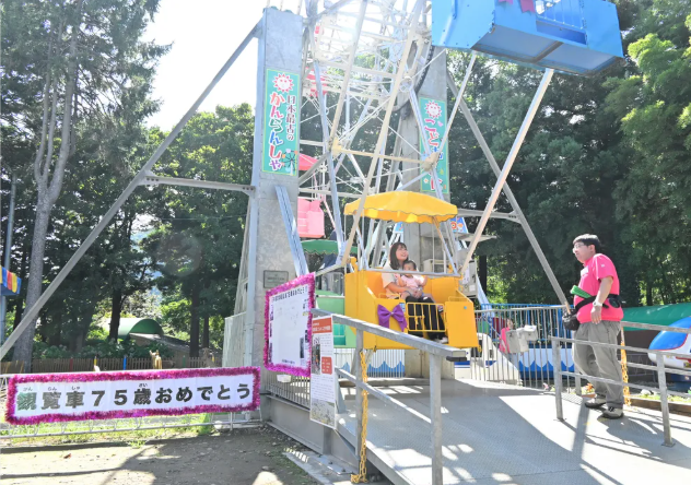 「誕生」から75年を迎えた日本最古の観覧車に乗る家族連れ