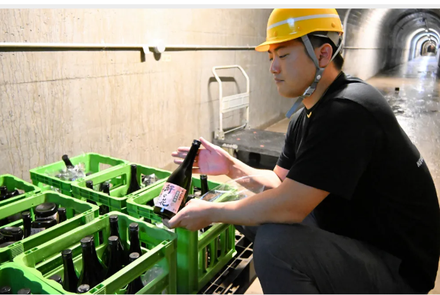 トンネル内で熟成させた日本酒を手に取る笹松屋の小原慎平店長